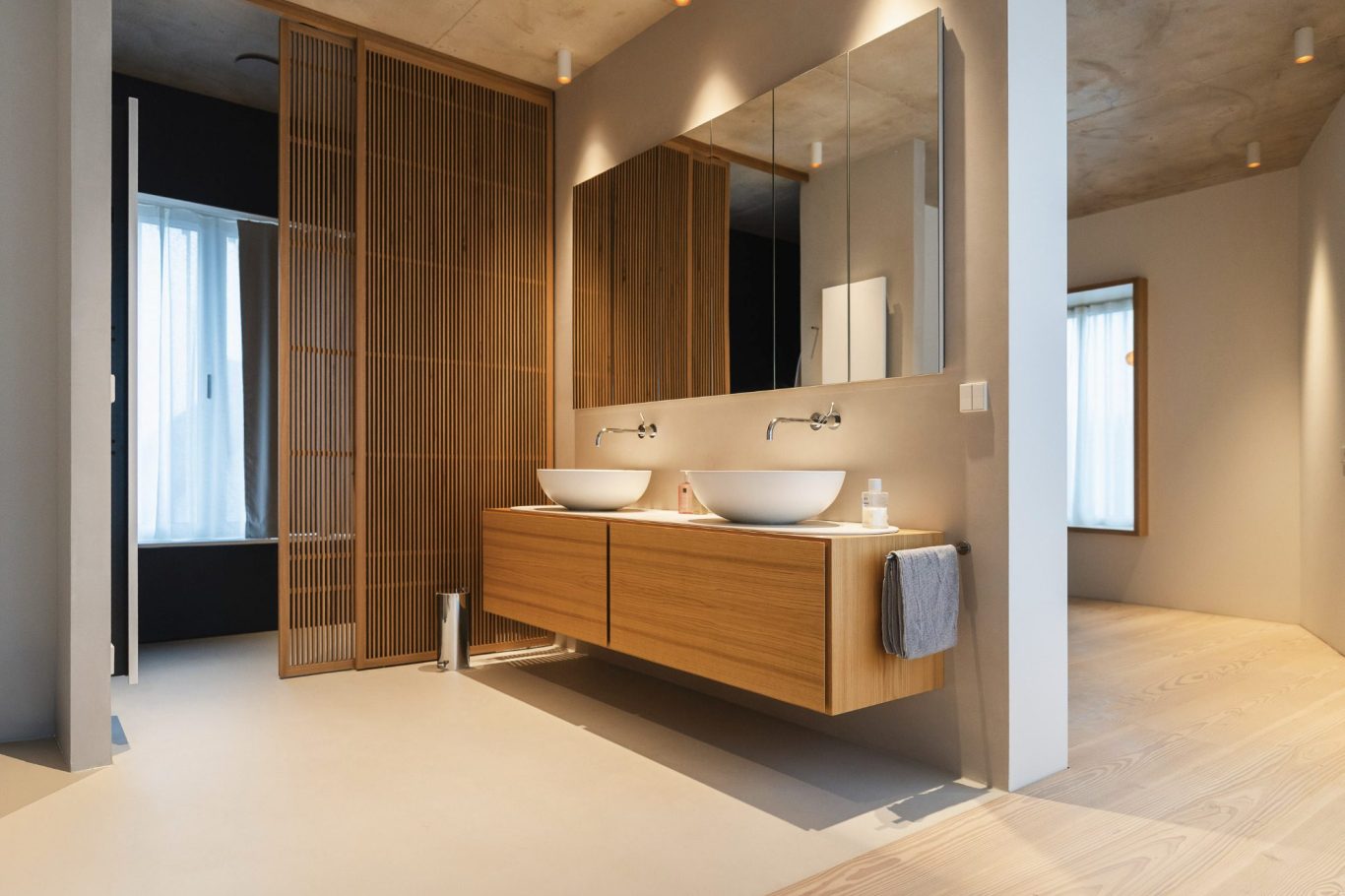 und direkter Beleuchtung zwischen den Spiegeltüren.