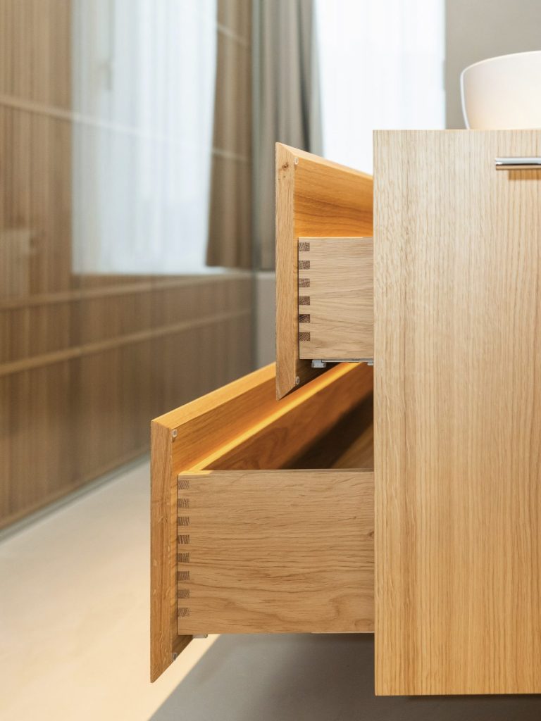 Schubläden in Eiche massiv.